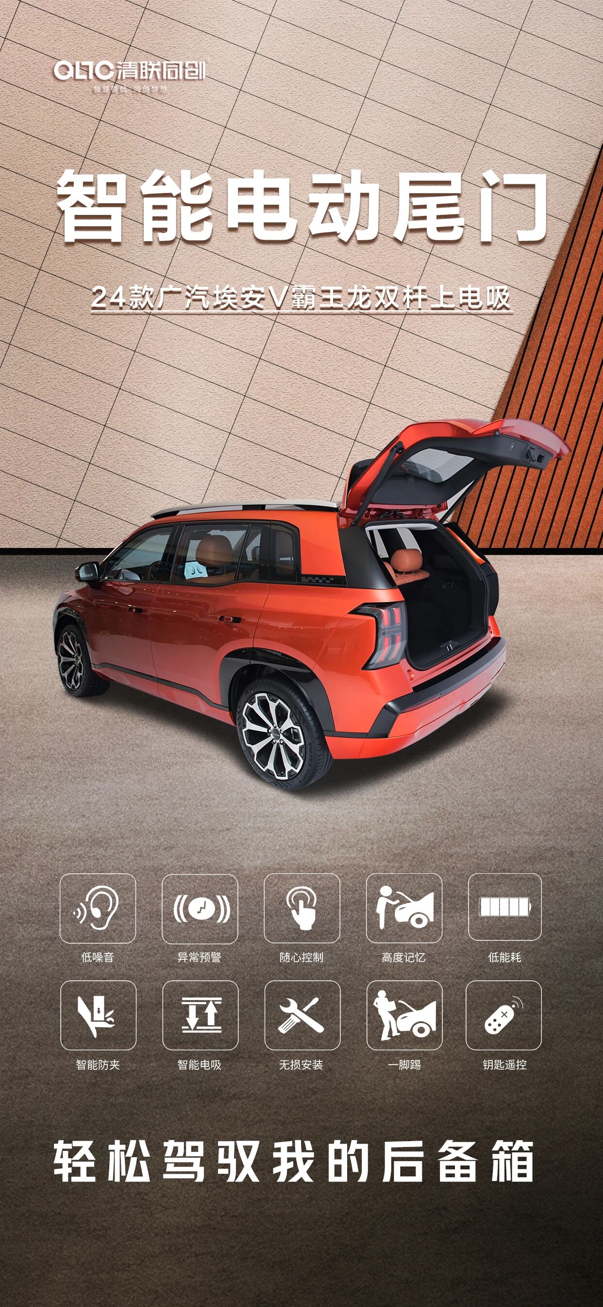 清联同创此次推出的智能电动尾门,专为广汽埃安V霸王龙量身定制。其独特的双杆上电吸设计,不仅运行稳定且异常安静,每一次开关门都如同行云流水般自然流畅,为您的爱车增添一抹不凡的尊贵气息。